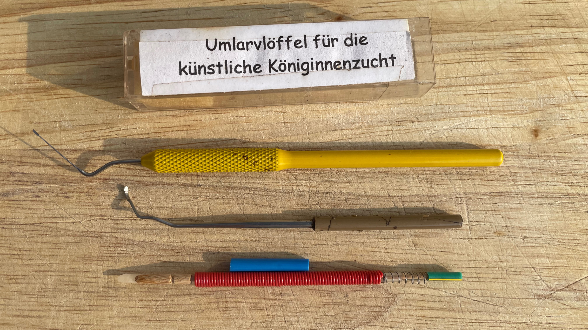 - Aus einem anderen guten Volk werden die 1-2 Tage alte Larven der Arbeitsbienen aus ihren sechseckigen Zellen entnommen und in künstliche runde Königinnenzellen umgesetzt. Das nennt man „umlarven“. Man reiht diese Königinnenzellen in einem Zucht-Rähmchen auf und setzt sie in das Pflegevolk, das nun versucht, alle Königinnen aufzuziehen.